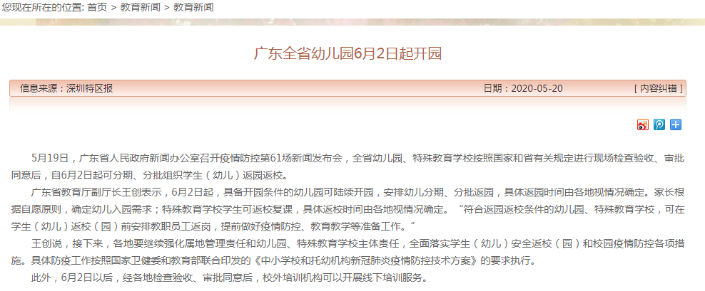 5月19日下午,广东省召开疫情防控新闻发布会,广东省教育厅副厅长王创在会上宣布全省幼儿园复学的时间为6月2日,可分期分批组织幼儿园返校。